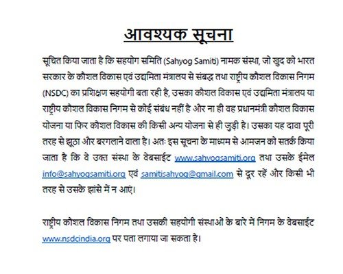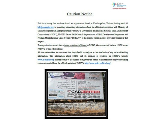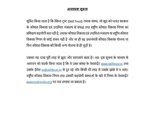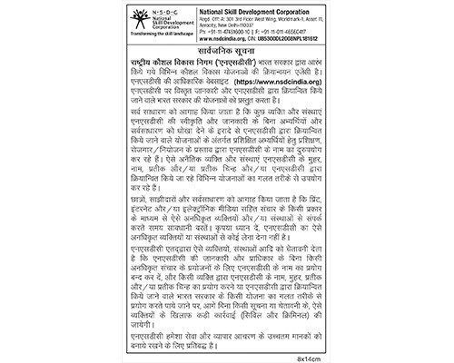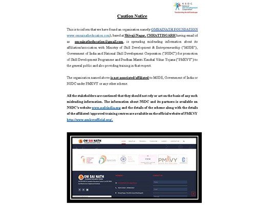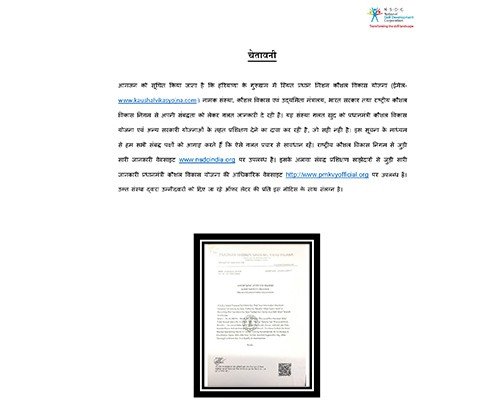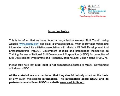 It has been brought to PMKVY team’s notice that some unauthorized and unscrupulous persons are attempting to falsely use the name / logo of MSDE, Skill India, NSDC and PMKVY with respect of their businesses and falsely representing that they are Approved / Affiliated Training Partners / Centres for implementing PMKVY with or without job offer with a malafide and dishonest intention to mislead and defraud innocent and unwary members of the public.